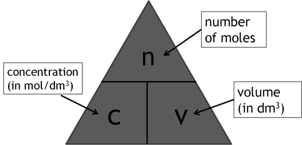 Concentration (C) = moles of solute (n) / volume of solution (V)
